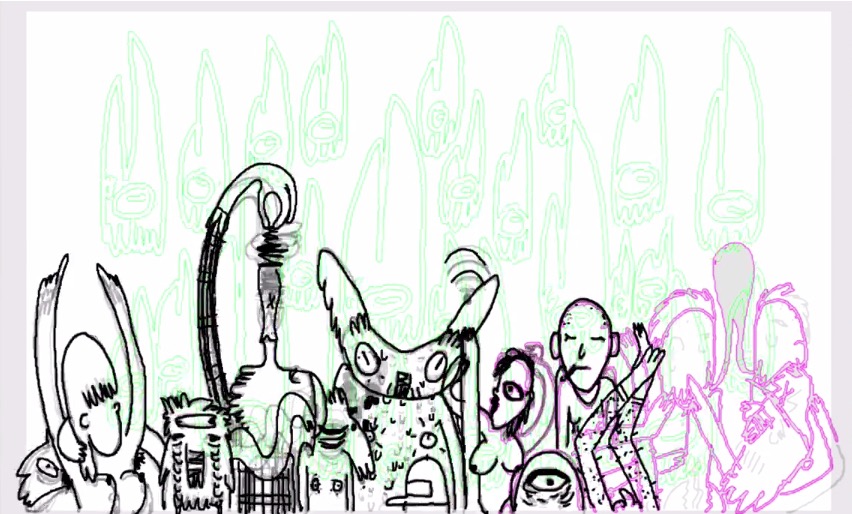 artistas são convidados a adentrar uma sala escura, onde desenham ao vivo em alto e bom som randômico. nesta edição, o fantástico mundo de neems abrindo os trabalhos.
